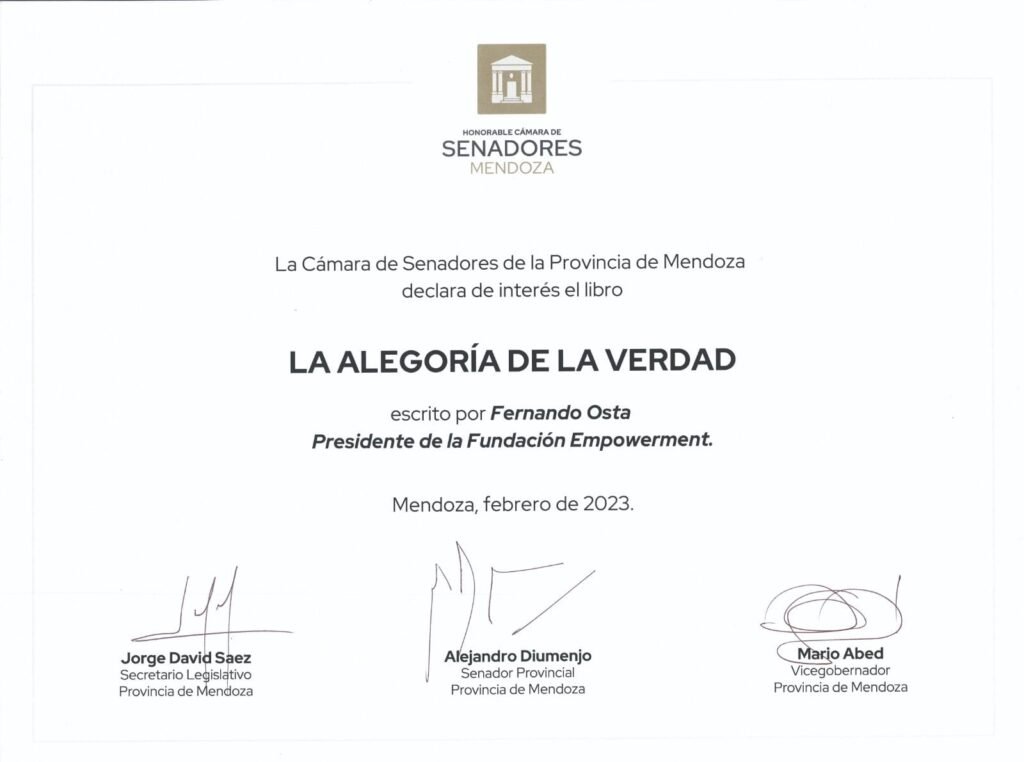 “En el libro La Alegoría de la Verdad, de Fernando Osta, de manera compleja, pero con sencillez, nos lleva a descubrir cómo llegar a la esencia de nuestro ser autentico a través de tener consciencia que la verdad, basada en el amor y el dar, es lo que nos da libertad, dignidad y por último la sensación de paz, que nos lleva al bienestar integral.”